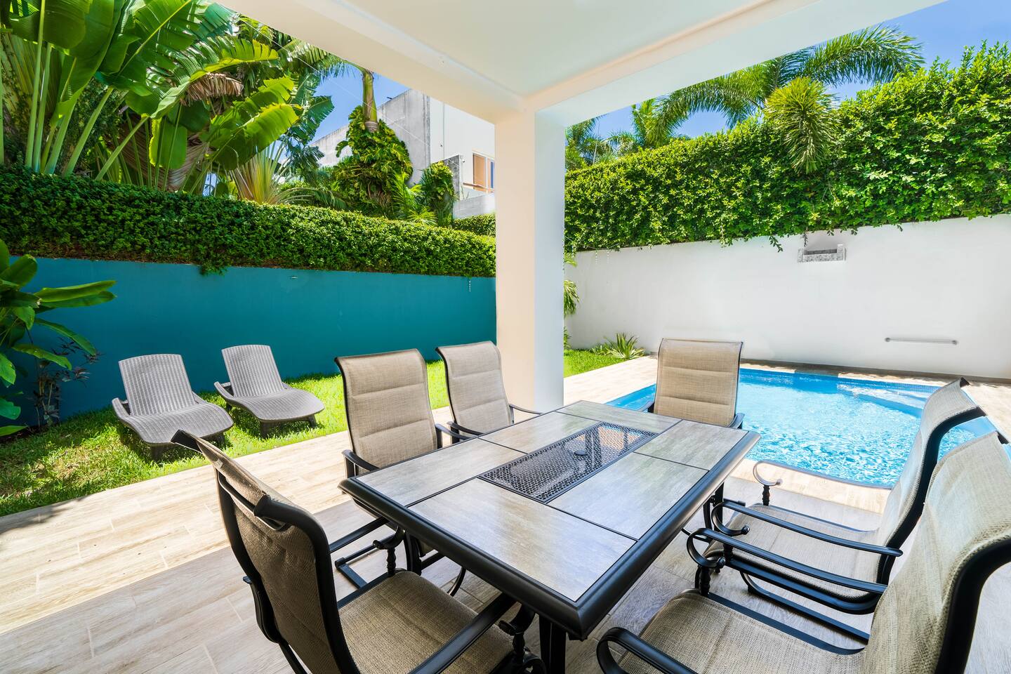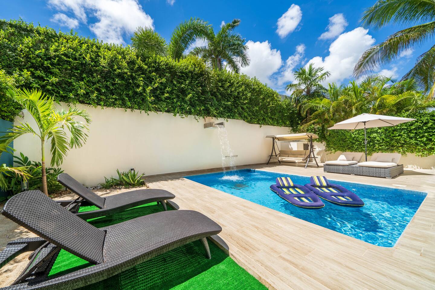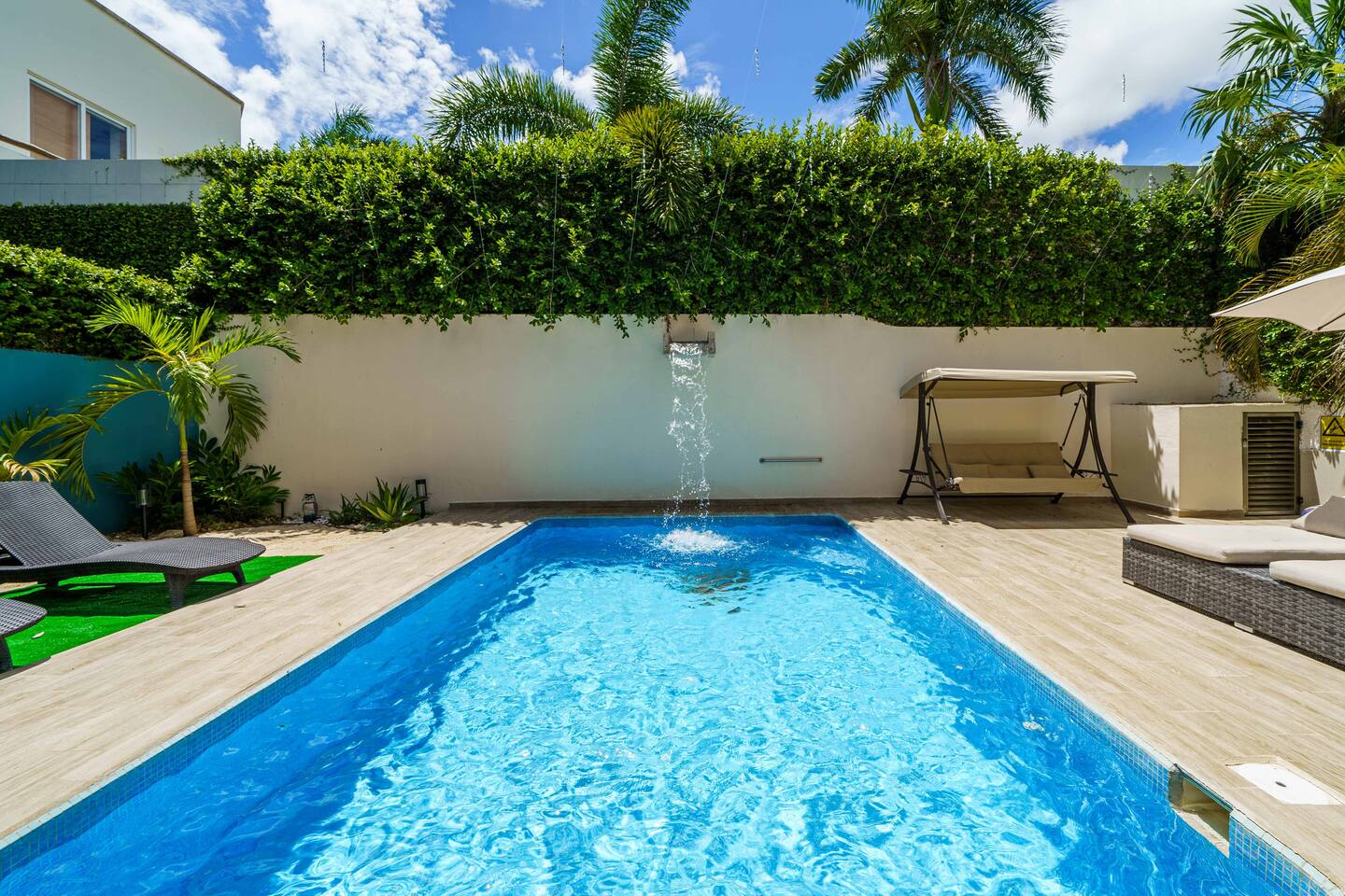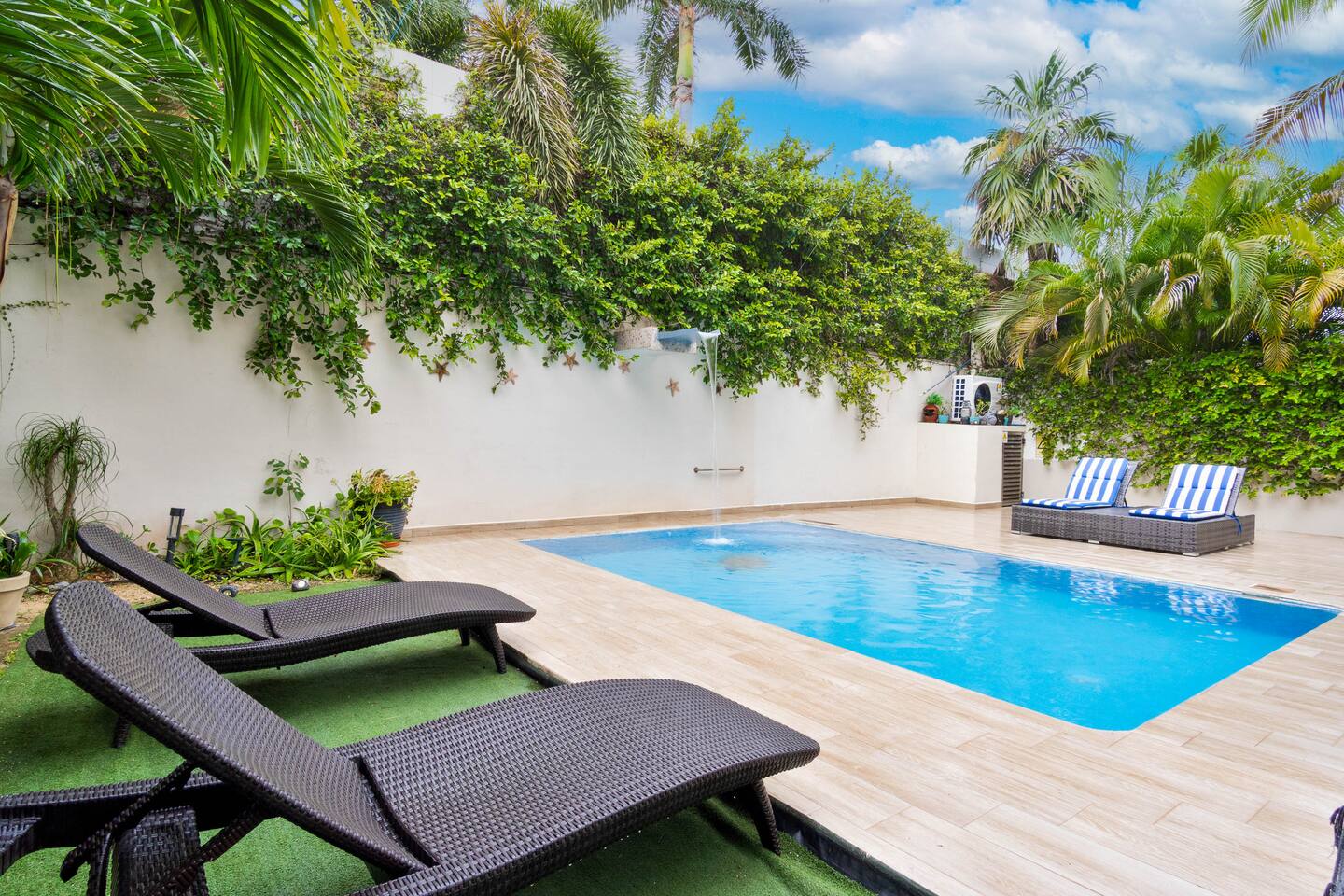 Diviértete en la piscina climatizada, y descansa en una de las increíbles 4 suites. Excelente ubicación en una zona residencial tranquila con todo tipo de comercios caminando. - Alberca privada con cascada y climatizada - 4 Suites con Smart TV de 60 pulgadas, A/C y baño en Suite - Cocina totalmente equipada - Seguridad 24/7 - Estacionamiento gratis - Wi-Fi rápido 300 mbps - Nintendo Switch con Super Mario *** Un traslado desde el aeropuerto GRATIS por estancias de 4 noches o más ***